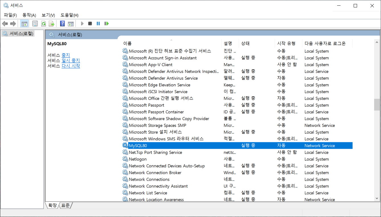 μ°Έκ³ λ‘ MySQLμ΄ μ€μΉλ λ MySQL80μ΄λΌλ μλΉμ€ μ΄λ¦μΌλ‘ μλΉμ€κ° μ€νλλ€λ λ©μμ§κ° 보μ λλ€.