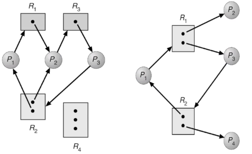 - ๊ทธ๋ํ์ cycle์ด ์์ง๋ง ๋ชจ๋ Resoucr Block์ ์์์ด ํ๋์ฉ๋ง ์๋ ๊ฒ์ด ์๋๋ผ๋ฉด (์ฌ๋ฌ๊ฐ๊ฐ ์๋ Block์ด ์กด์ฌํ๋ค๋ฉด) deadlock์ผ ์๋ ์๊ณ ์๋์๋ ์๋ค. (์ถ๊ฐ์ ๊ฒ์ฆ ํ์)