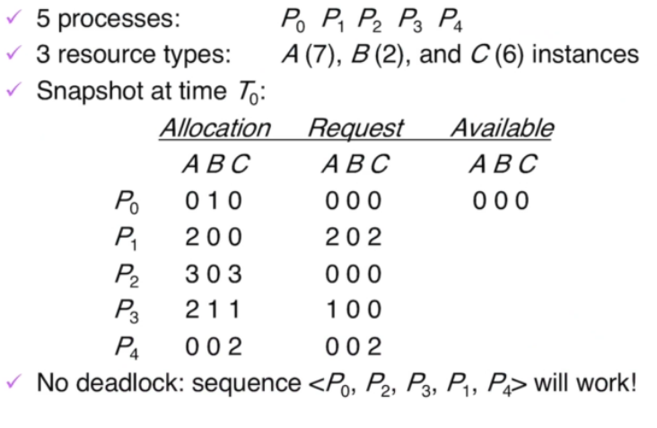 - ํ๋ก์ธ์ค์ sequence <P1, P2, ..., Pn>์ด safeํ๋ ค๋ฉด Pi์ ์์์์ฒญ์ด "๊ฐ์ฉ ์์ + ๋ชจ๋ Pj (i < i)"์ ์ํด ์ถฉ์กฑ๋์ด์ผ ํจ.