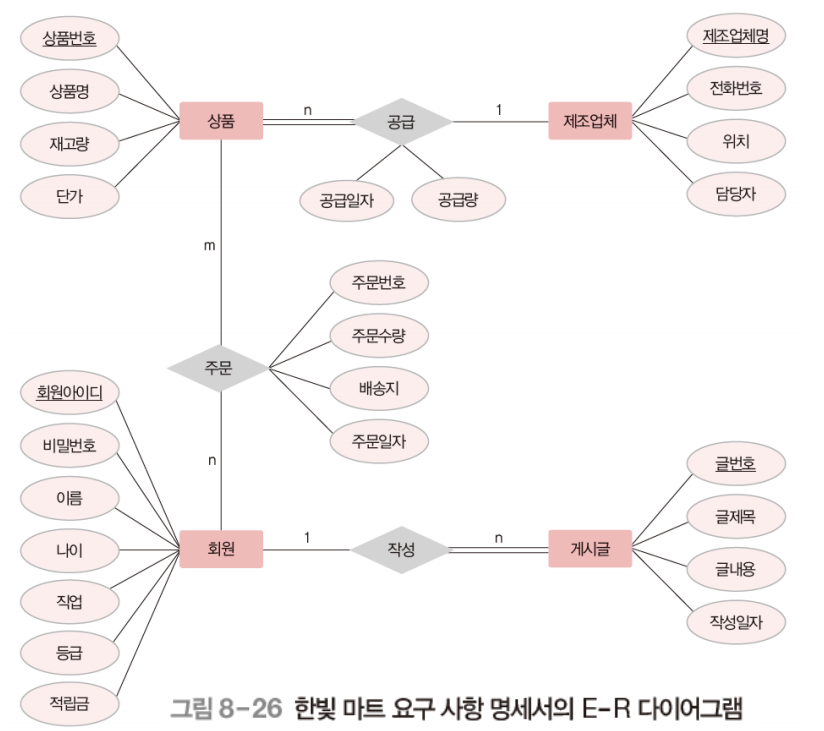 - ์๊ตฌ ์ฌํญ ๋ถ์ ๊ฒฐ๊ณผ๋ฅผ ๊ธฐ๋ฐ์ผ๋ก ์ค์ํ ๊ฐ์ฒด๋ฅผ ์ถ์ถํ๊ณ ๊ฐ์ฒด ๊ฐ์ ๊ด๊ณ๋ฅผ ๊ฒฐ์ ํ์ฌ E-R ๋ค์ด์ด๊ทธ๋จ์ผ๋ก ํํ