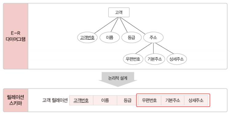 E-R ๋ค์ด์ด๊ทธ๋จ์ ๋ค์ค ๊ฐ ์์ฑ์ ๋ ๋ฆฝ์ ์ธ ๋ฆด๋ ์ด์ ์ผ๋ก ๋ณํ