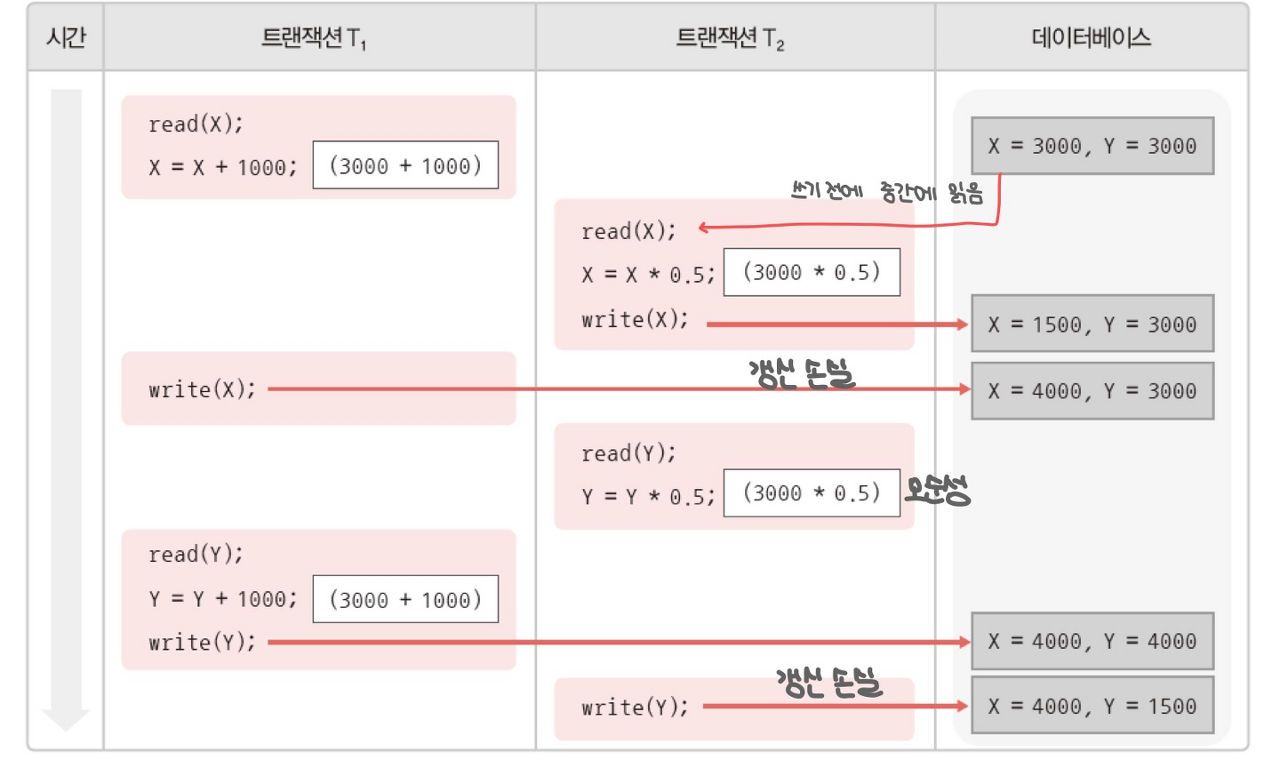 - ํ๋์ ํธ๋์ญ์ ์ด ์ํํ ๋ฐ์ดํฐ ๋ณ๊ฒฝ ์ฐ์ฐ์ ๊ฒฐ๊ณผ๋ฅผ ๋ค๋ฅธ ํธ๋์ญ์ ์ด ๋ฎ์ด์จ ๋ณ๊ฒฝ ์ฐ์ฐ์ด ๋ฌดํจํ๋๋ ๊ฒ