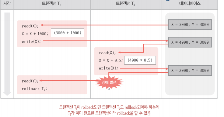 - ํธ๋์ญ์ ์ด ์๋ฃ๋๊ธฐ ์ ์ ์ฅ์ ๊ฐ ๋ฐ์ํ์ฌ rollback์ฐ์ฐ์ ์ํํ๋ฉด, ์ด ํธ๋์ญ์ ์ด ์ฅ์ ๋ฐ์ ์ ์ ๋ณ๊ฒฝํ ๋ฐ์ดํฐ๋ฅผ ๊ฐ์ ธ๊ฐ ๋ณ๊ฒฝ ์ฐ์ฐ์ ์คํํ ๋ ๋ค๋ฅธ ํธ๋์ญ์ ์๋ rollback์ฐ์ฐ์ ์ฐ์์ ์ผ๋ก ์คํํด์ผ ํ๋ค๋ ๊ฒ