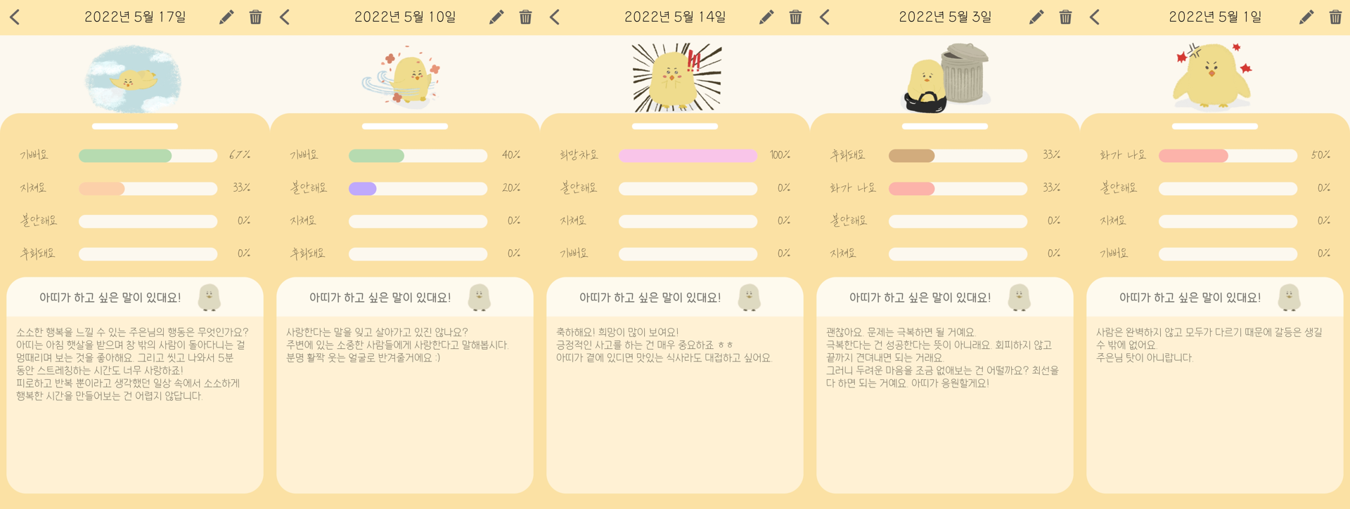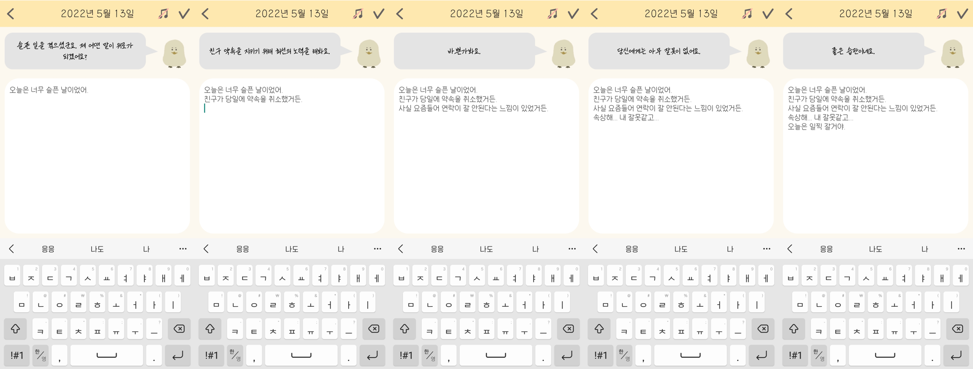 ๊ฐ์ ์ผ๊ธฐ ๋ด์ฉ์ ๋ํ ์ฑ๋ด์ ์๋ต์ ๋น๊ตํด๋ณด๊ฒ ์ต๋๋ค.
