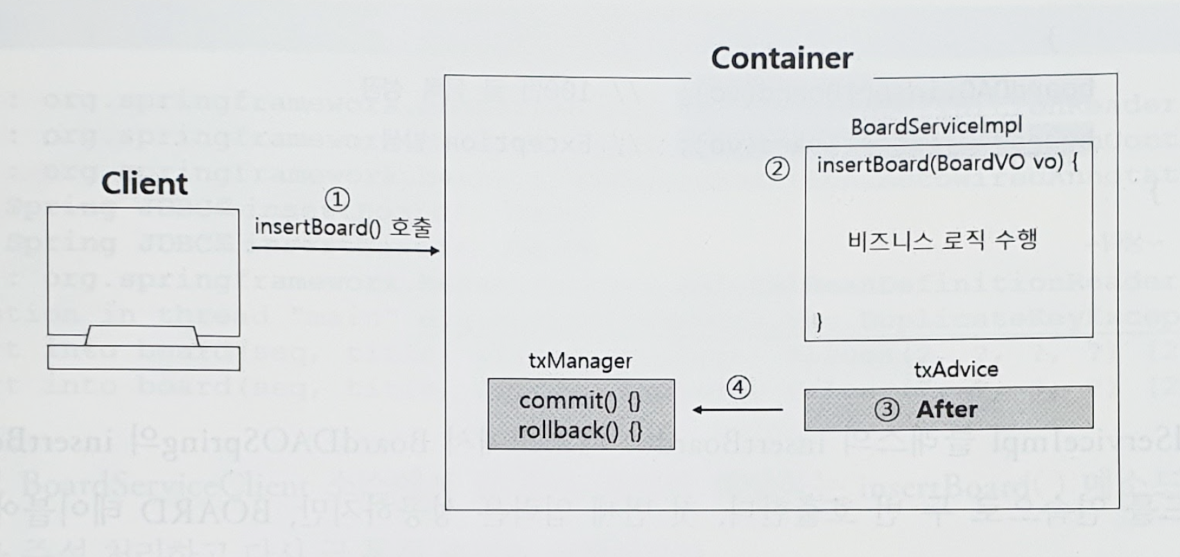 โ ํด๋ผ์ด์ธํธ๊ฐ BoardServiceImpl ๊ฐ์ฒด์ insert() ๋ฉ์๋๋ฅผ ํธ์ถํ๋ฉด, โก insertBoard() ๋ฉ์๋์ ๋น์ฆ๋์ค ๋ก์ง์ด ์ํ๋๋ค.