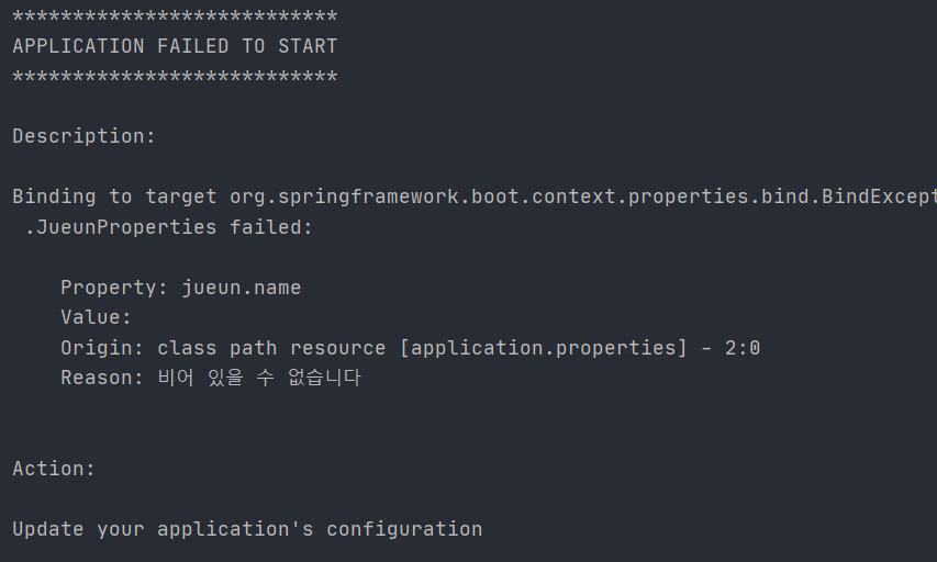 @ConfigurationProperties("jueun") // jueun์ด๋ผ๋ ํค ๊ฐ์ผ๋ก ํ๋กํผํฐ ์ฌ์ฉ. getter/setter ํ์